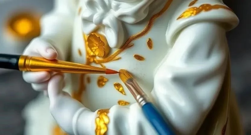 - Покраска (при необходимости): Если скол или трещина находятся на расписной посуде, необходимо восстановить утраченные элементы росписи.