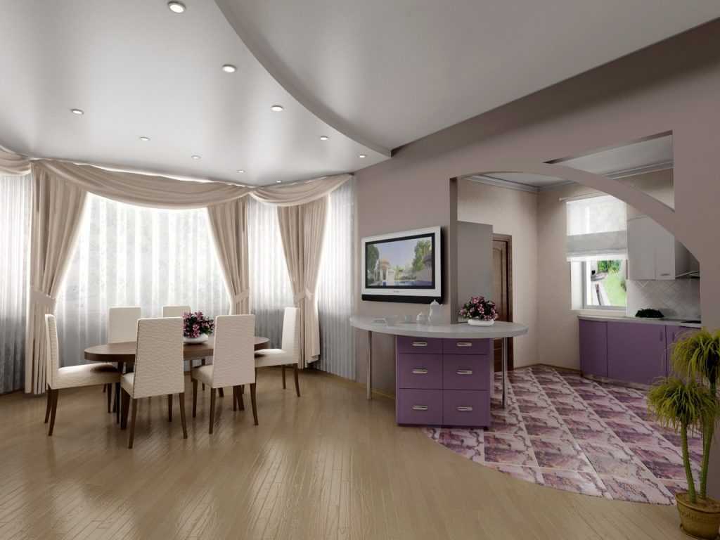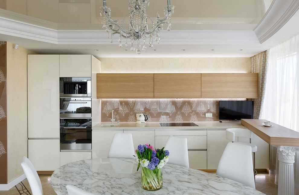 Двухуровневый сатиновый натяжной потолок в интерьере кухни-гостиной