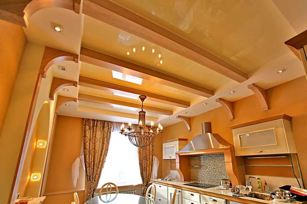Многоуровневые глянцевые натяжные потолки в интерьере кухни классического стиля