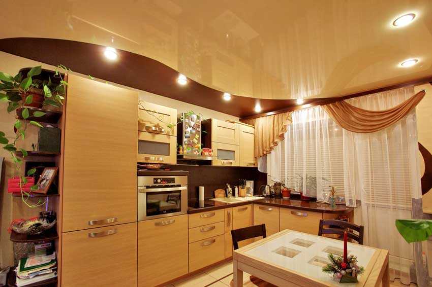 Глянцевый двухуровневый потолок на кухне