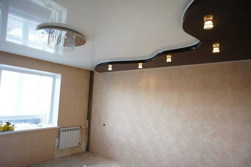 В «хрущевках» потолки маленьких комнат оформляют двусторонними или односторонними волнистыми вариантами. В первом случае изгибы каркаса монтируют вдоль двух противоположных стен, а во втором – вдоль одной. Как правило, контрастная двухуровневая волнистая конструкция служит для подчеркивания каких-либо проекций на полу или стенах, выделения интерьерных элементов. Например, «волна» над окнами с использованием подсветки визуально расширит помещение, а на кухне позволит добавить света над рабочей поверхностью.