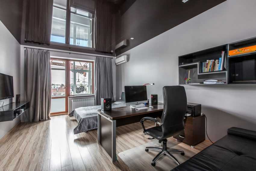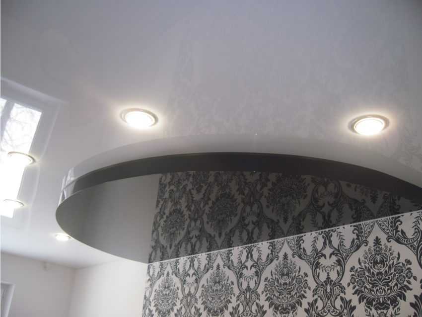 Для современного стиля например, такого, как хай-тек, подойдет глянцевое натяжное полотно черного цвета. Чтобы помещение не выглядело слишком мрачным, темным оттенком можно выделить только один функциональный участок.