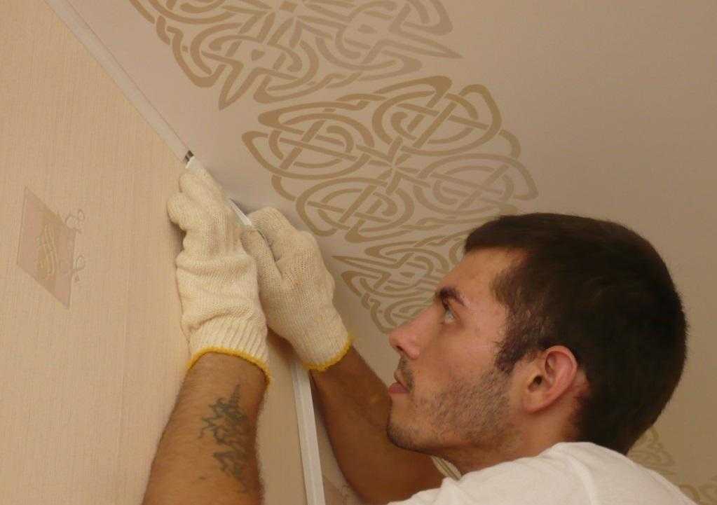 - Работы начинаются с установки специального профиля по всему периметру комнаты. Крепить его можно как к стене, так и к потолку.