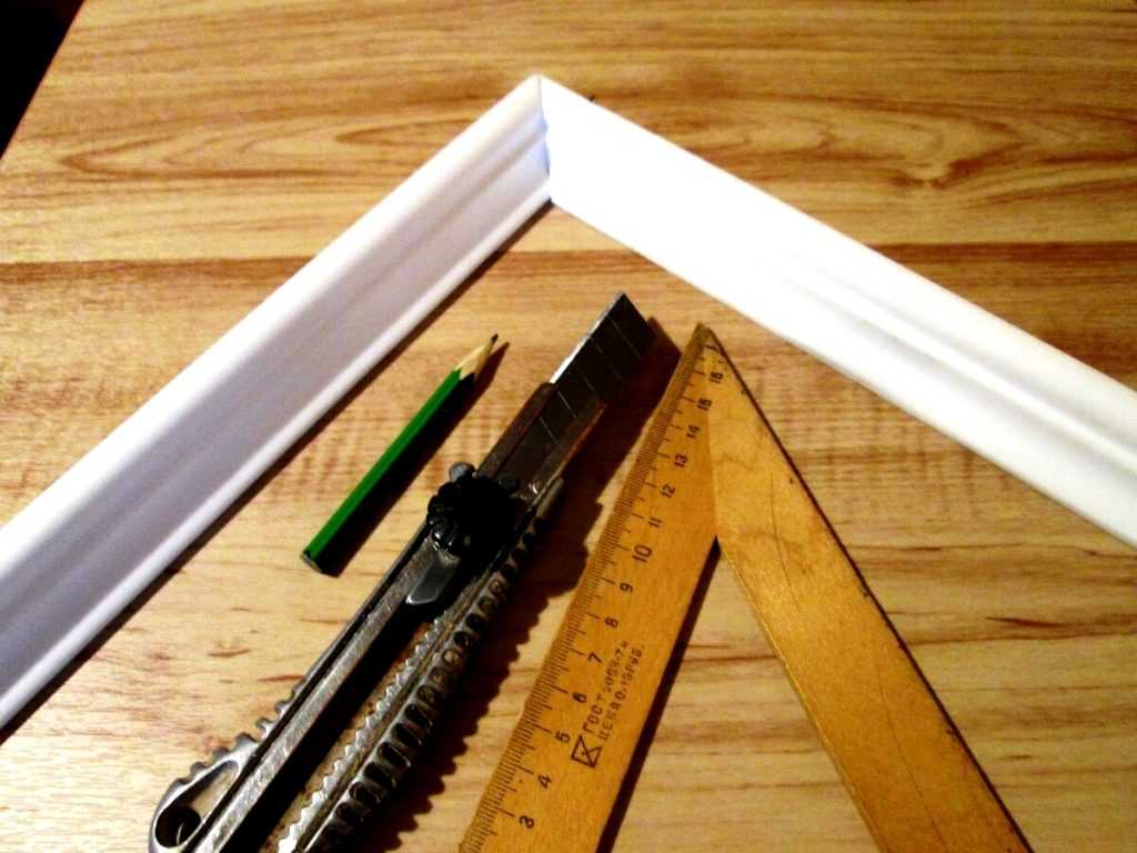 Заготовки нарезаются с помощью стусла и ножовки по разметке. Чтобы проверить правильность вырезанных заготовок, можно состыковать «ваше творение» на полу. Если все углы сходятся правильно, то можно приступать к приклеиванию и стыковать их уже на месте.
