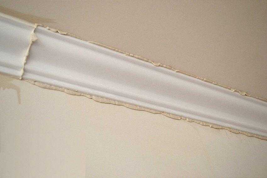 Если зазор между плинтусами получился значительно больше, то не стоит отчаиваться. Герметик поможет решить данную задачу. Также в большой зазор можно затолкать узкую полоску потолочного плинтуса, а после закрепить клеем.