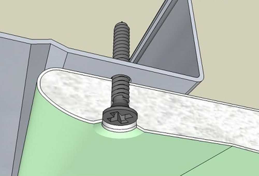 - Листы крепятся при помощи саморезов шагом в 20 см. От края необходимо отступать 10 см. Между листами должны остаться стыки в 1–2 мм. С внешними углами листы стыковать нельзя. Необходим отступ в 10 см. В противном случае в месте стыковки появятся трещины.