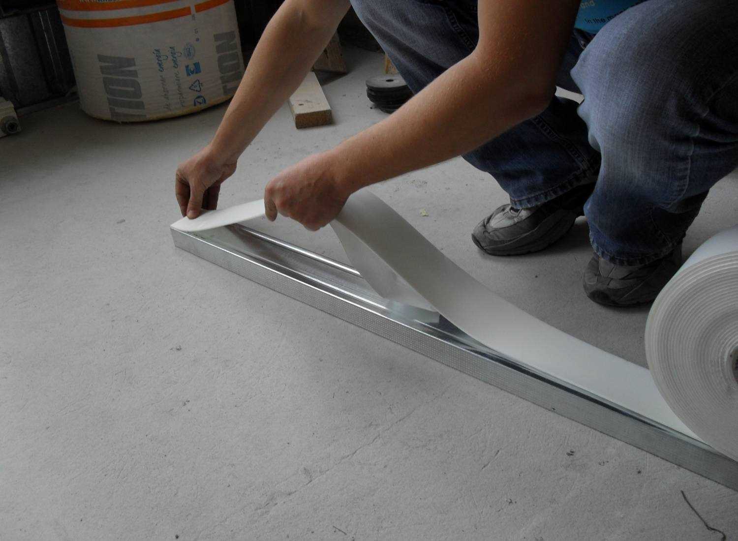 Для уплотнения пространства между бетоном и металлом, на отштукатуренную поверхность фиксируется демпферная лента. Она компенсирует нагрузку и глушит звуки. Ленту можно приклеить или прикрутить саморезами.