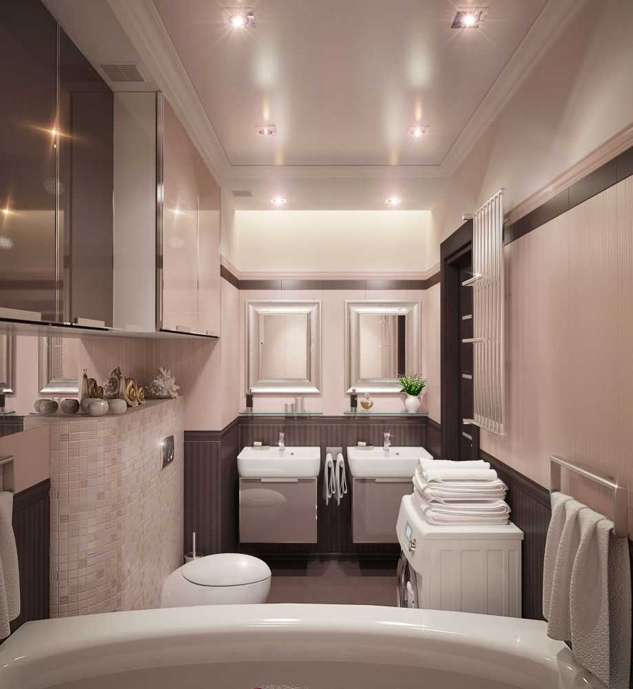 Важно: потолок не должен противоречить общей стилистике ванной комнаты, гармонируя по цвету и форме с остальными элементами интерьера. Примеры на фото: