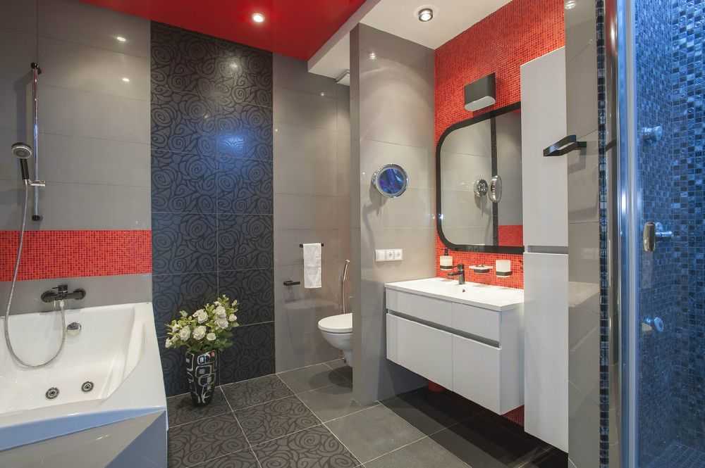 - Красный – подарит помещению энергии. Но постарайтесь не переборщить с оттенком, да и другие цвета должны быть максимально нейтральными. Постарайтесь использовать красный цвет в мелких аксессуарах. Например, в стакане для зубной щетки, мыльнице или коврике на полу.