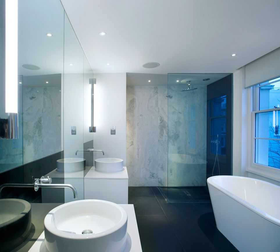 - Освещение можно сделать как общим, так и точечным. В последнем случае появляется возможность зонирования помещения при помощи светильников, что позволяет добиться более уютной атмосферы в ванной комнате.