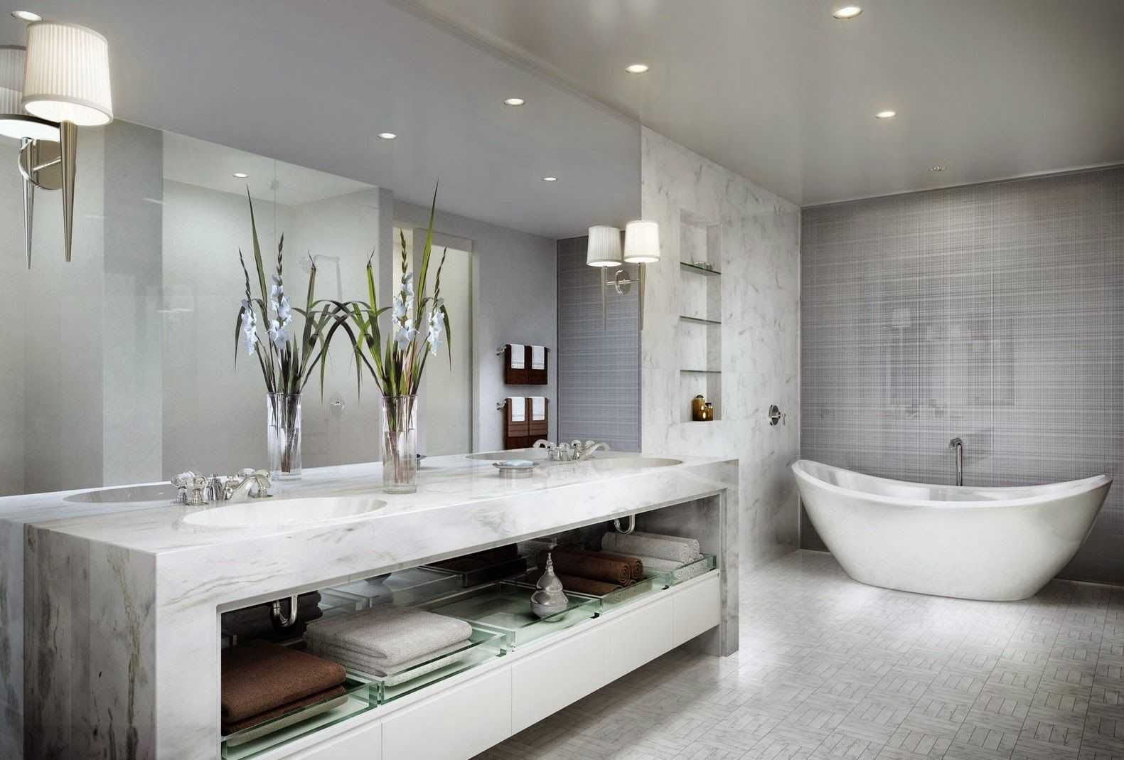 В ванной комнате основным рабочим местом, считается зеркало над раковиной. По мнению дизайнеров, идеально выполняет свои функции освещения, зеркало со встроенной подсветкой. Также можно применить лампочки дневного света, обрамление галогенными лампочками или бра с матовым абажуром.