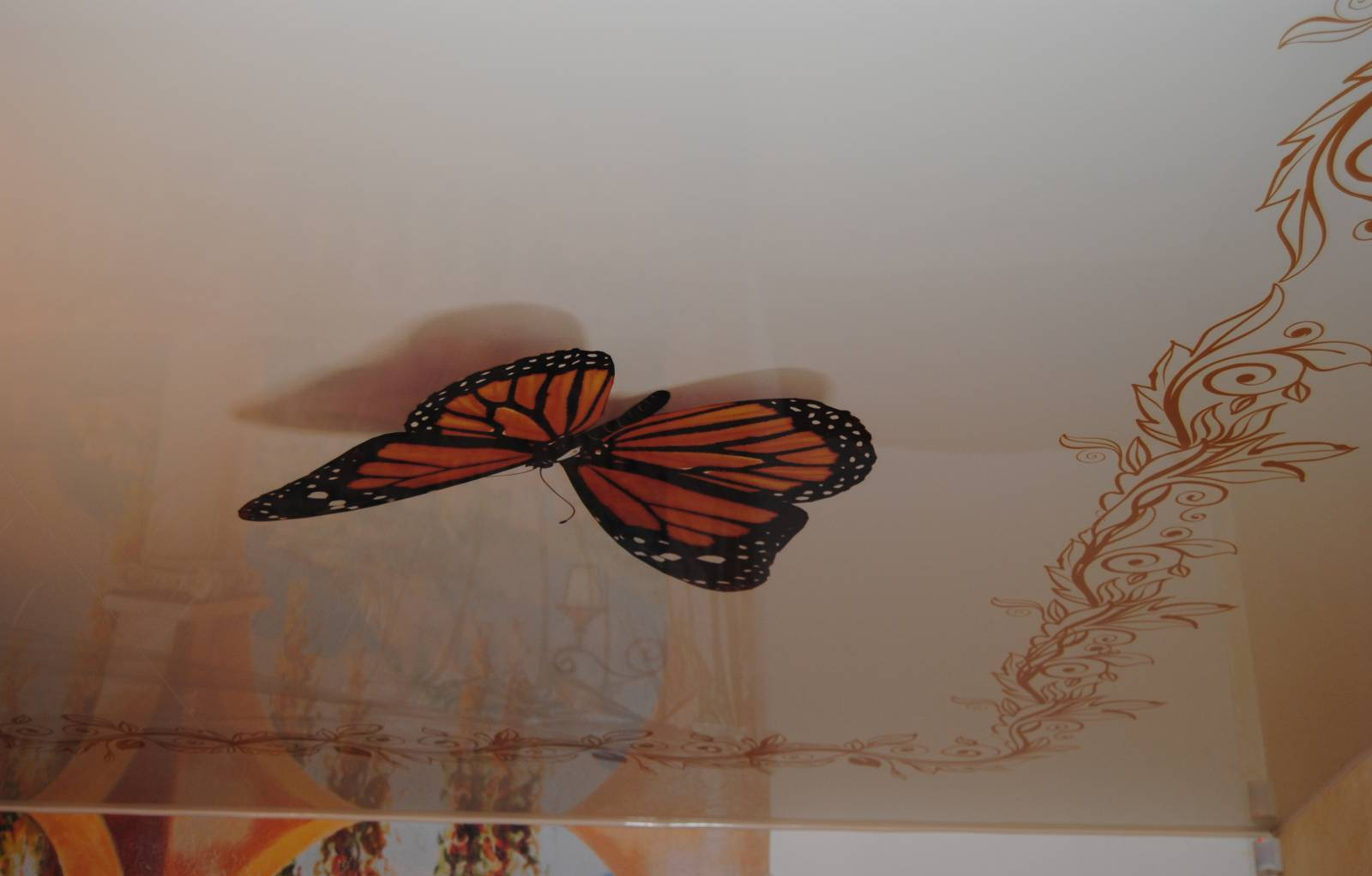 Важно, чтобы стиль 3д соответствовал общему настроению, создаваемому интерьером помещения. При этом не обязательно стремиться создать на потолочной поверхности абсолютный шедевр, например, для обычной городской квартиры можно использовать простые белые натяжные потолки с изображением бабочки в углу