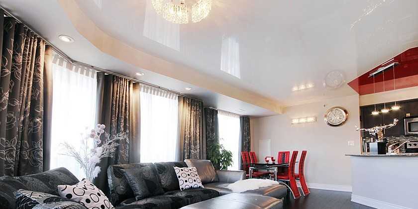 Глянцевые конструкции, в первую очередь, помогают увеличить количество света в помещении. Они отражают до 96% процентов попадающих на них световых лучей. Несмотря на это, потолок не выглядит зеркальным, хотя силуэты людей и предметов в его отражении будут слегка различимы. Благодаря такому свойству полотна, появляется эффект зрительного увеличения комнаты, что, бесспорно, является хорошим решением в дизайне интерьера помещений с небольшой высотой. Стоимость такого пололка варьируется от 550 до 1300 рублей за квадратный метр.