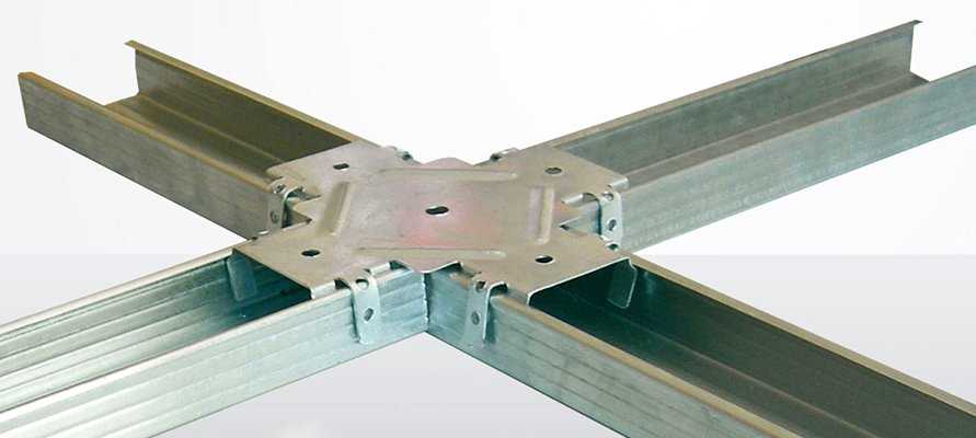 Шаг 4. Закрепите профили или стрингеры на подвесах. Также профили основного каркаса надо скрепить со стартовым, исключение составляет только реечный и кассетный потолки — в этом случае соединять их в единую конструкцию необязательно.