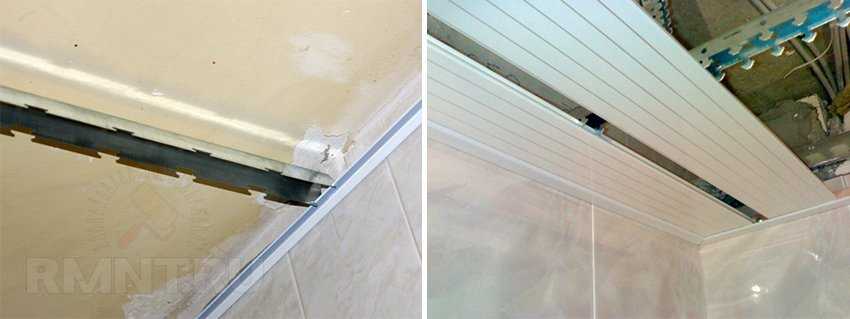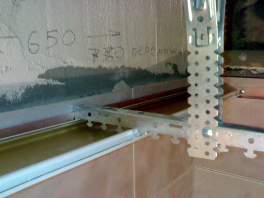 В просторных помещениях на расстоянии 50-60 см от стен поперек предполагаемого расположения реек отметьте линии крепежа траверсов. Если ширина санузла меньше 1,5 м, то дополнительный крепеж не обязателен. Можно обойтись угловым профилем.