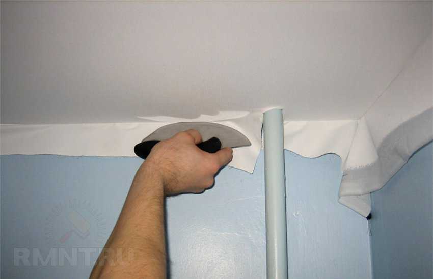 Тканевые потолки можно монтировать полностью самостоятельно, начиная от крепления багетного профиля и заканчивая натяжкой самого полотна. Всё, что потребуется из специнструмента — шпатель скруглённой формы, которым ткань заправляют в паз, да пара чистых перчаток.