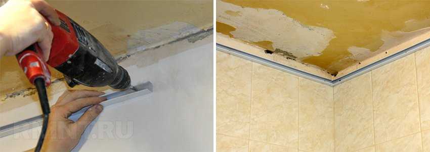 - маркером в углу комнаты отмечают уровень нового потолка. Расстояние между профилем и черновой поверхностью должно составлять не менее 5 см. Если планируется замаскировать конструкцией инженерные коммуникации или встроить массивные приборы освещения в реечный потолок, расстояние увеличивают;
