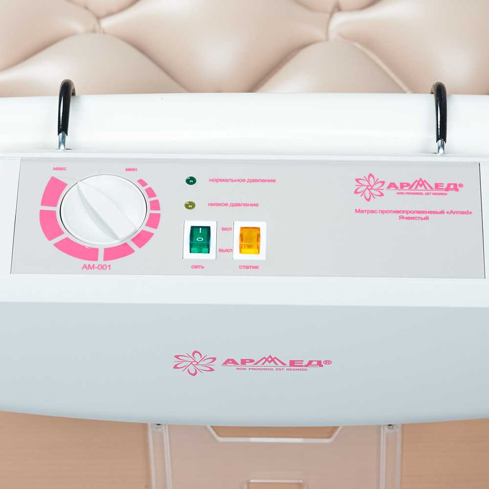Противопролежневые матрасы Армед ячеистого типа представляют собой двухслойную поверхность, разделенную на небольшие, похожие на пчелиные соты, капсулы. Они с помощью компрессора наполняются воздухом, который подается в них попеременно, обычно в шахматном порядке.