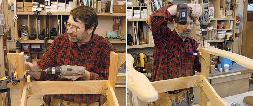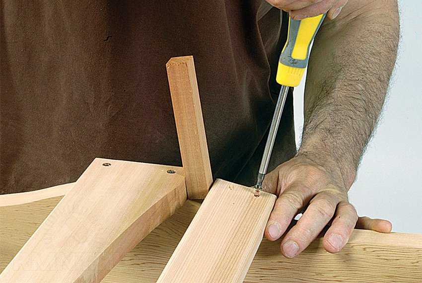 Большинство компонентов кресла соединяется шурупами, направляющие отверстия под них высверливаются комбинированным зенкером, подобранным по толщине винтов. Когда хотят скрыть шляпки, их углубляют и закрывают пробками-заглушками на клей.