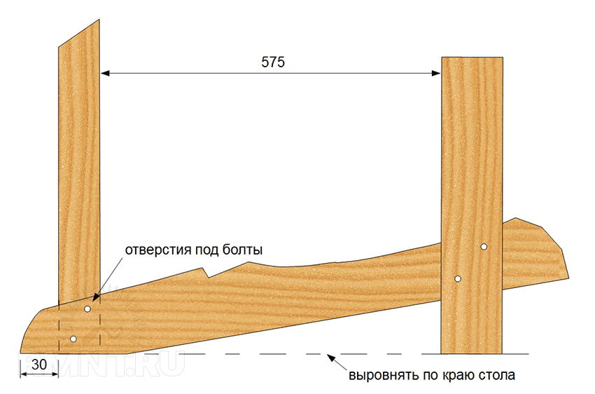 Опорная часть ножки подрезается под углом до 30°. Противоположный край доски подрезается под разницу между 90° и первым подрезом. В верхней части заготовки вырезается изгиб сиденья, хвосты задних ножек делаются немного тоньше.