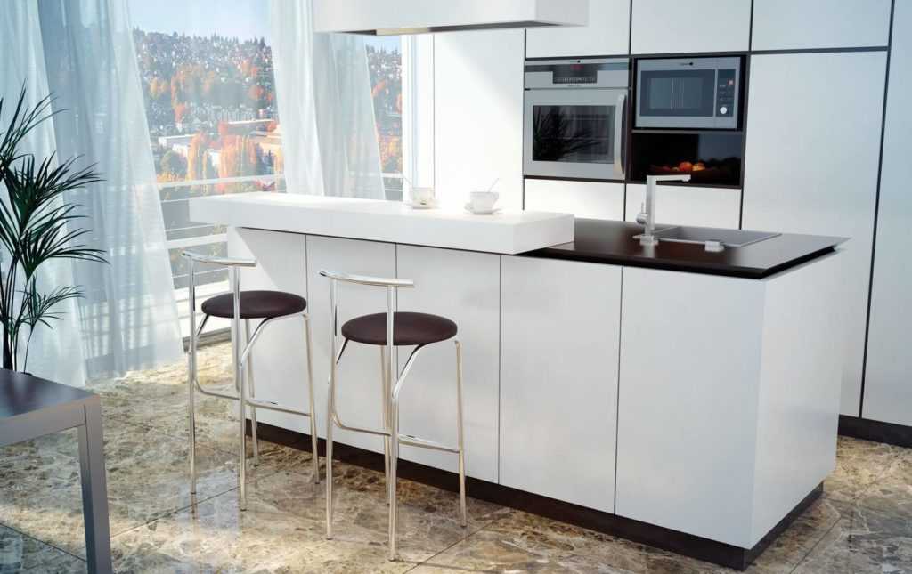 Как выбрать высоту барного стула, мы рассказали выше. Добавим, что этот параметр зависит от вида барной стойки. Она может как стоять отдельно, так и соединяться с кухонным гарнитуром.