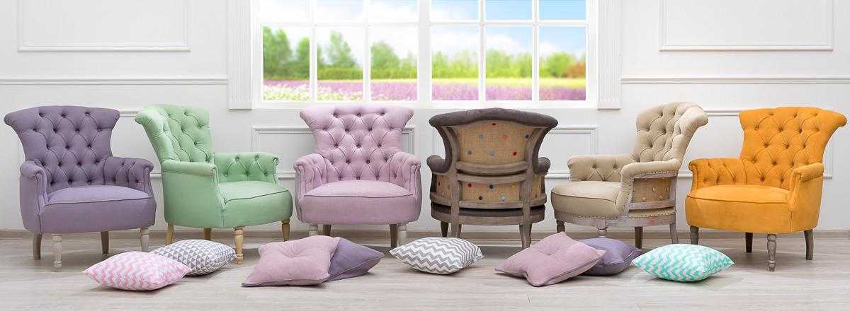 - Прованс. Основные отличия — изящные ножки, каретная стяжка, пастельные однотонные ткани или цветочный узор.