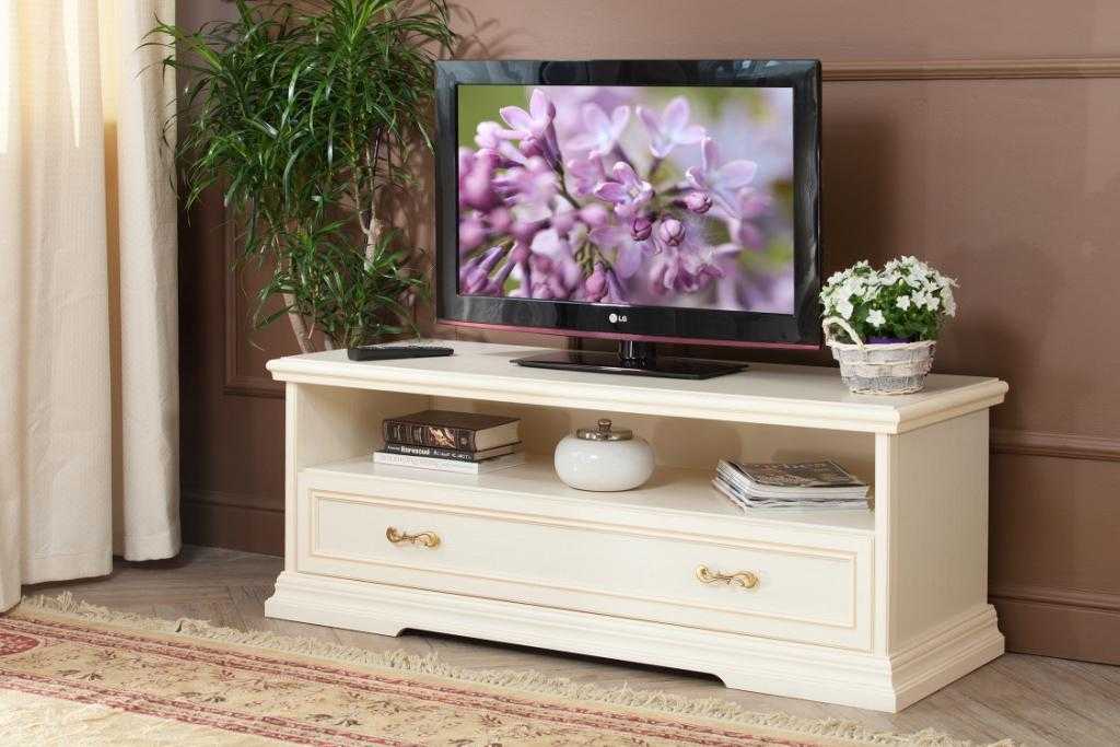 Для обстановки в стиле прованс подойдет мебель белого цвета. Если нельзя подобрать подставку подходящего оттенка, то можно дополнить ее предметами текстиля или креслом той же цветовой гаммы.