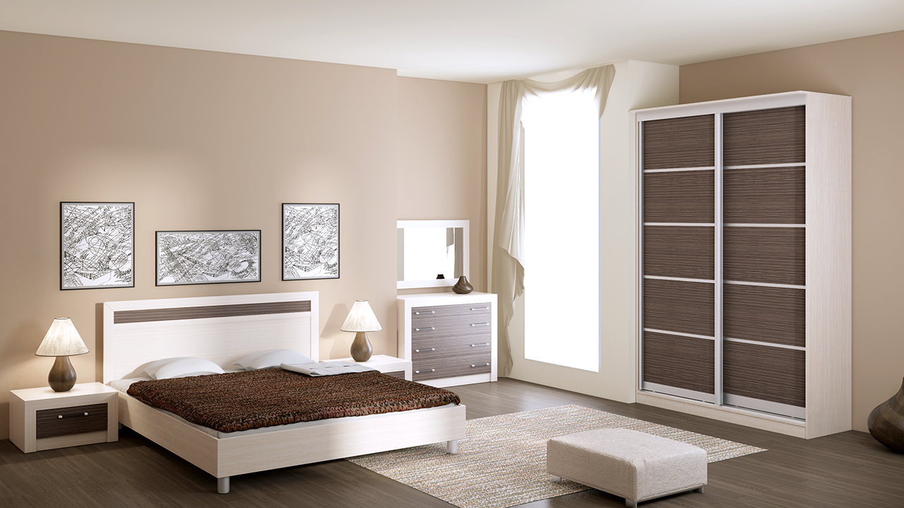 Модель с зеркальными полотнами гармонично расширит пространство спальни в бежевых тонах, дополняясь ручками, как у основной мебели.