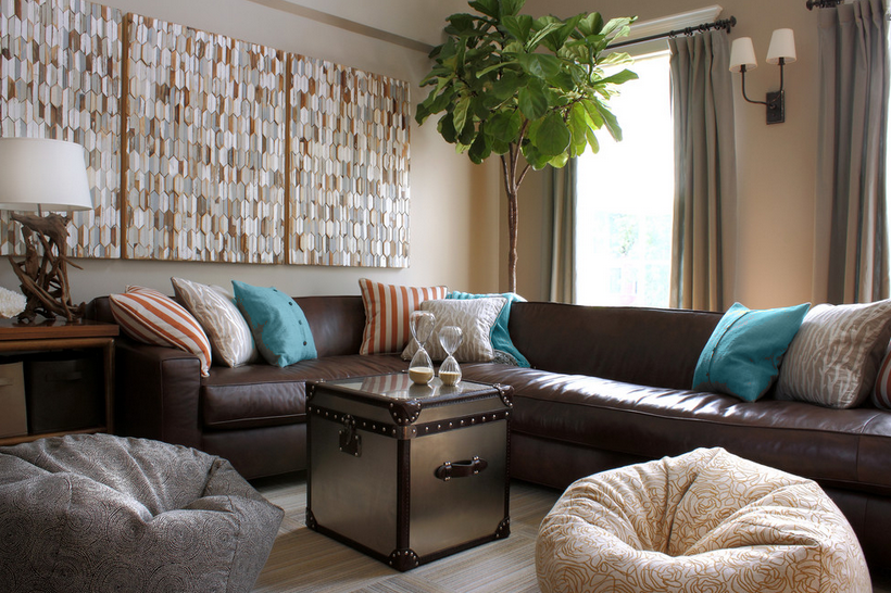 Нельзя назвать этот цвет популярным при оформлении комнаты отдыха. Но пара бирюза + насыщенный шоколад получается оригинальной и убедительной