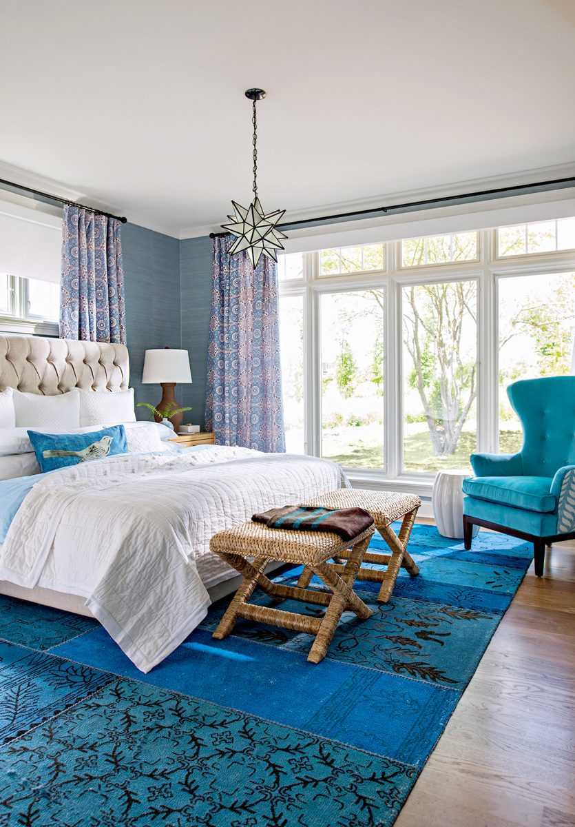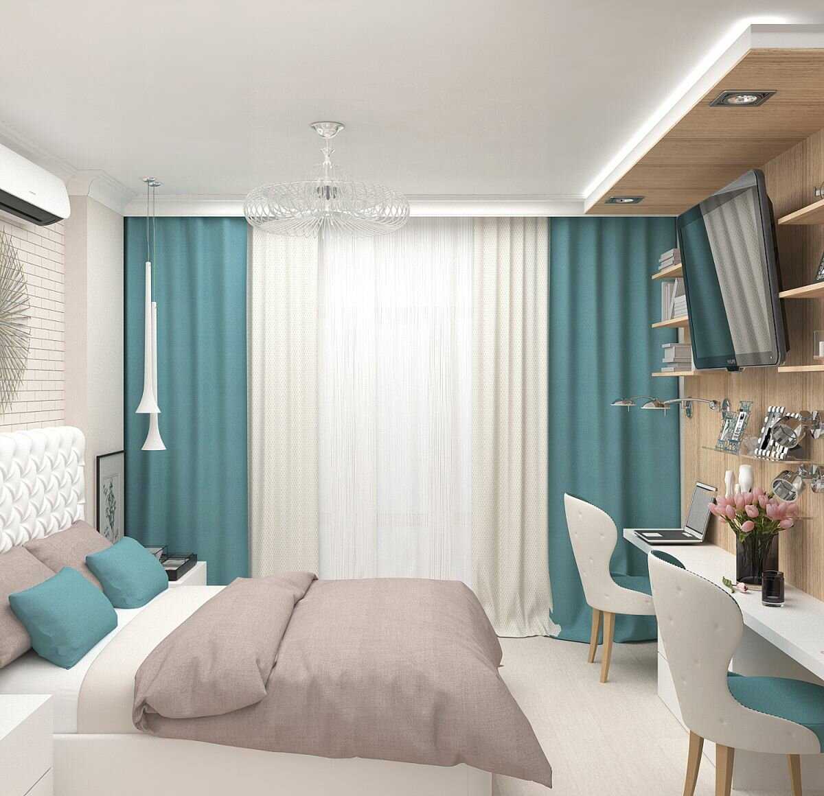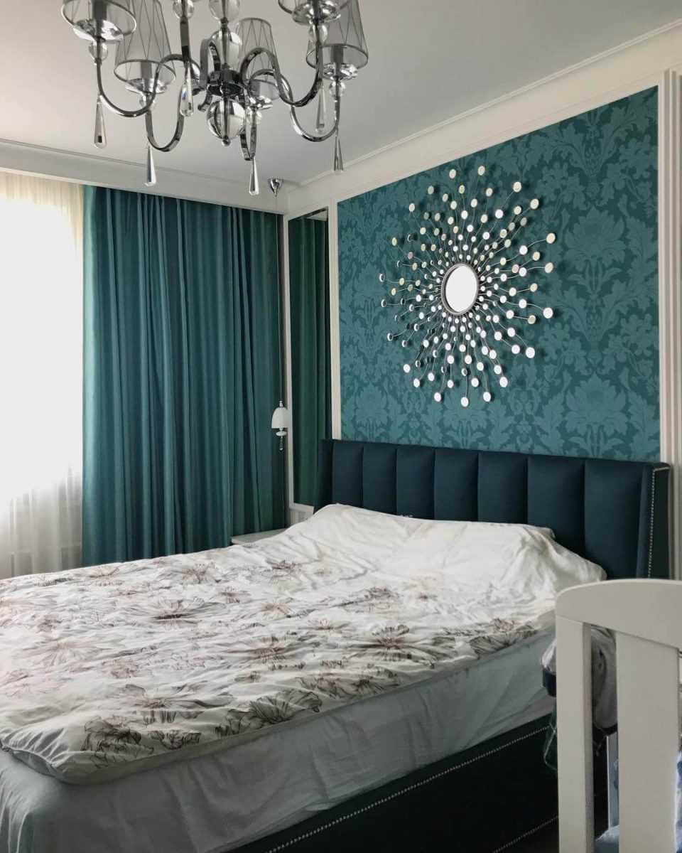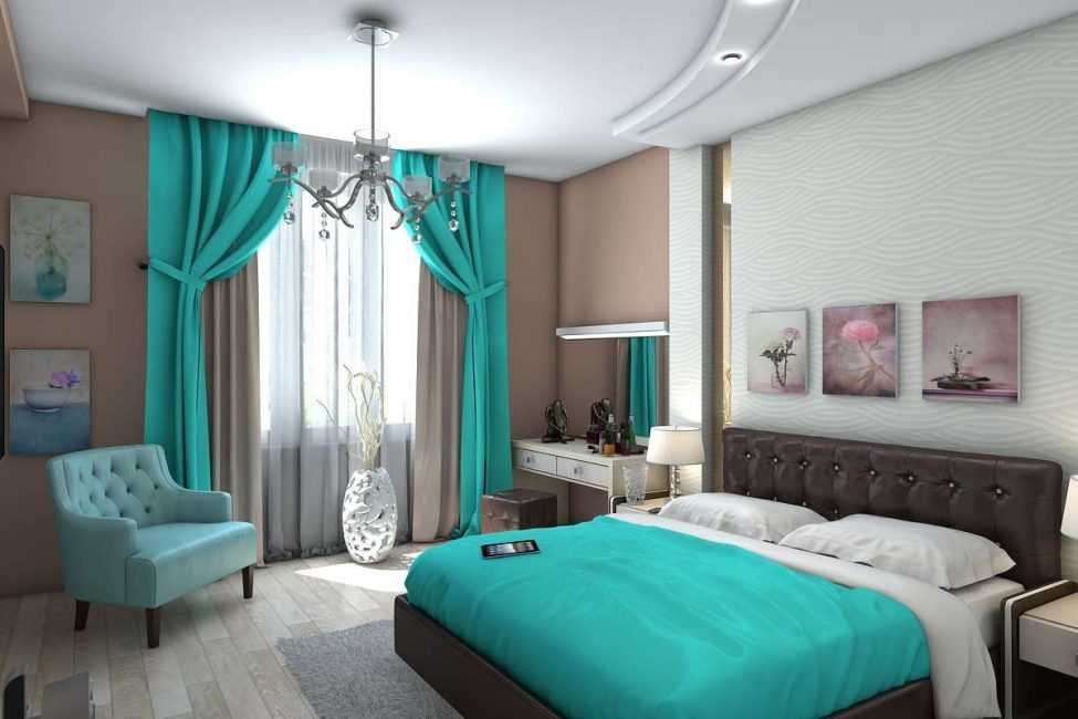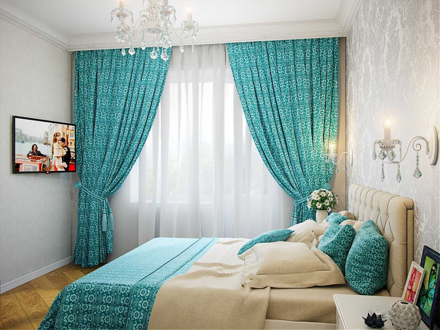 бирюзовые шторы являются частью дизайнерской концепции спальни