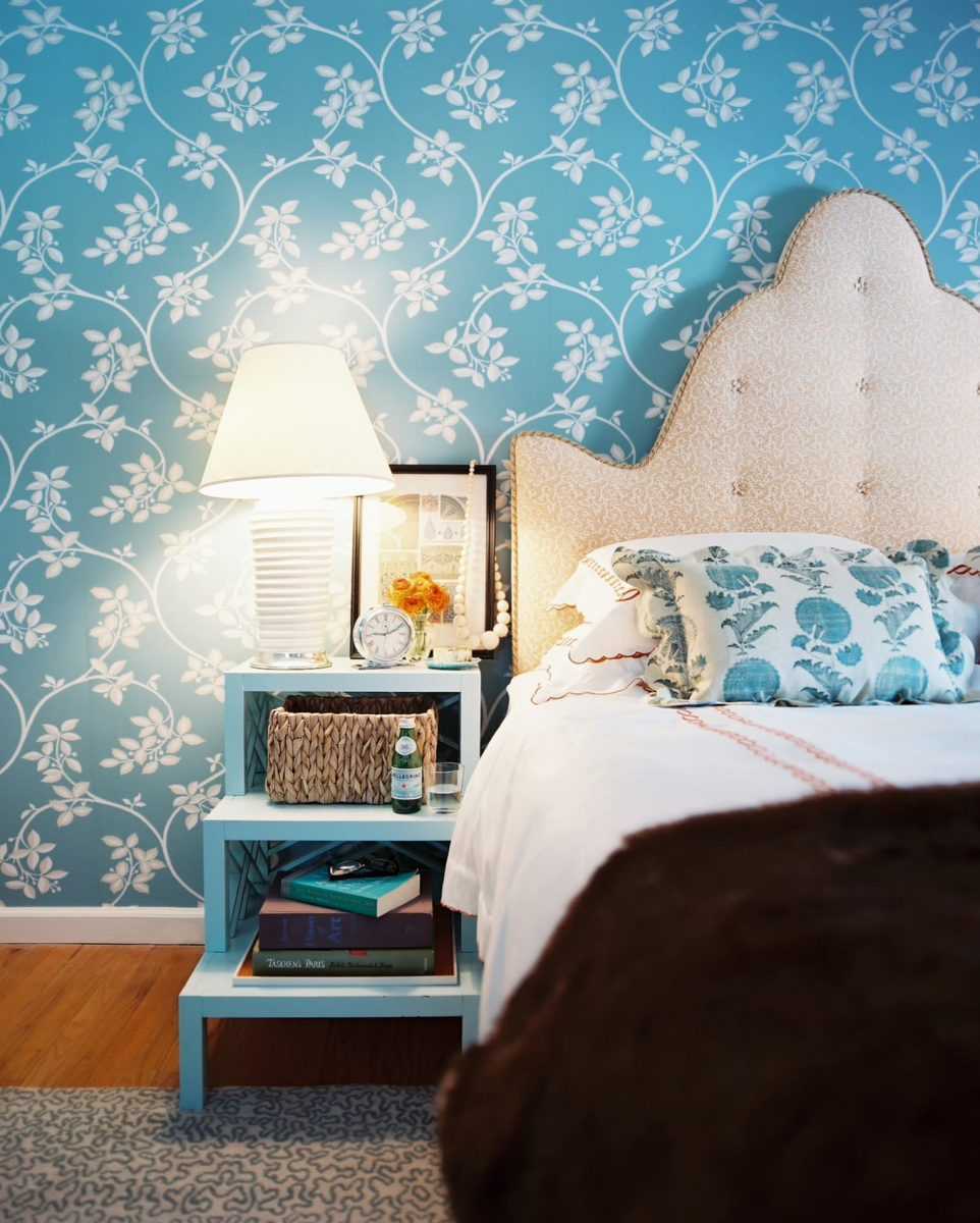 Для спальни лучше использовать светлые, спокойные оттенки бирюзового. Для отделки стен можно использовать обои с узором. Обои могут покрывать все стены или только одну, став главным украшением интерьера. Бирюзовая кровать и декоративные элементы гармонично смотрятся на светлом фоне стен.