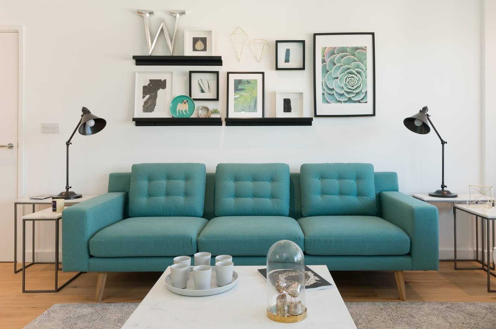 В гостиной со светлой отделкой диван цвета морской волны будет акцентировать на себе внимание и обозначит зону отдыха
