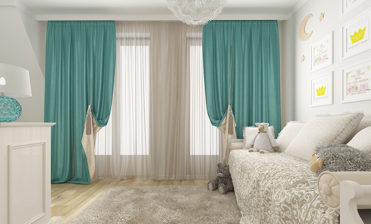 Для этой комнаты лучше выбрать бирюзовые раздвижные гардины.