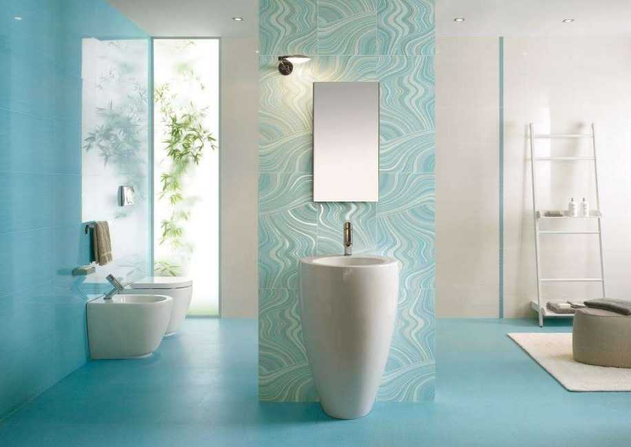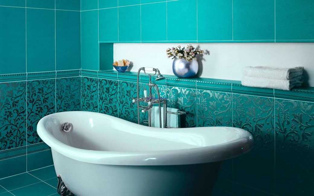 - если хочется расслабляющей, спокойной обстановки, рекомендуется выбирать отделку с бирюзовыми акцентами на бежевом фоне. Отличные идеи – узорчатый декоративный фриз, красочная напольная плитка. Возможно, подобный интерьер будет смотреться невзрачно. Зато такая композиция даже спустя несколько лет не будет раздражать. А яркости обстановке придадут небольшие декоративные элементы (полотенца, шторка для ванной, банные аксессуары);