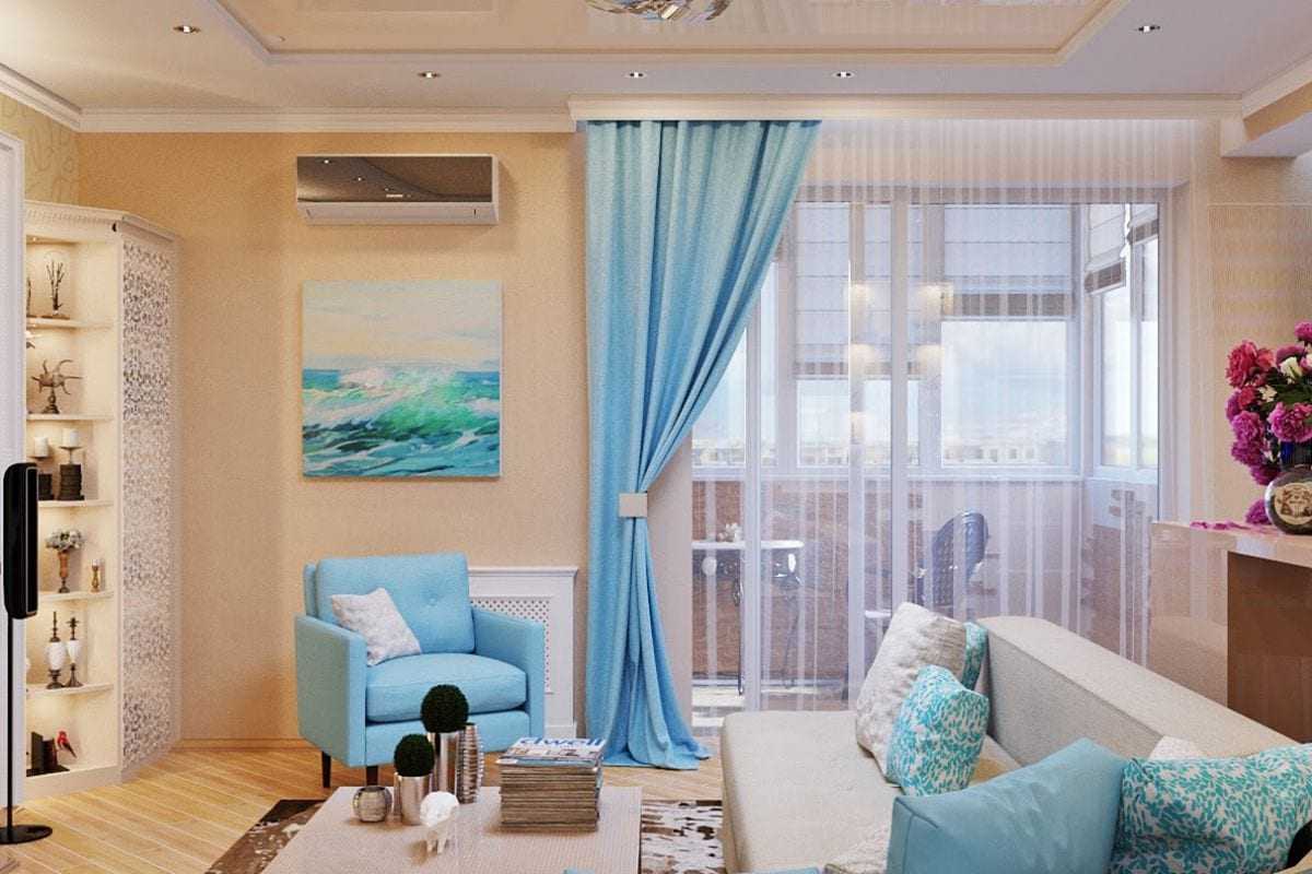 сочетание бирюзовых штор, мебели и потолка в гостинной