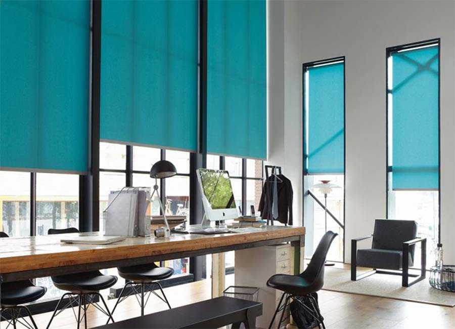 Шторы бирюзовых оттенков также используют при оформлении кабинетов и офисов.