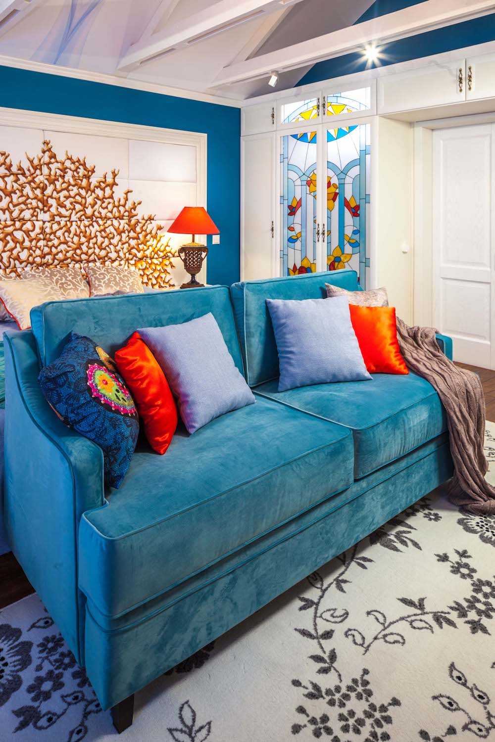 Зелено-голубой. Диван с таким насыщенным оттенком подходит к восточным интерьерам.
