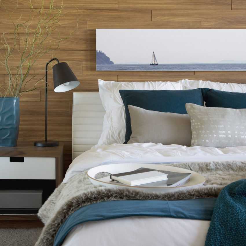 Оттенок размытой бирюзы привносит в спальню ощущение свежести и умиротворенности, напоминает об отпуске на море. Сочетать его лучше с пастельными тонами.