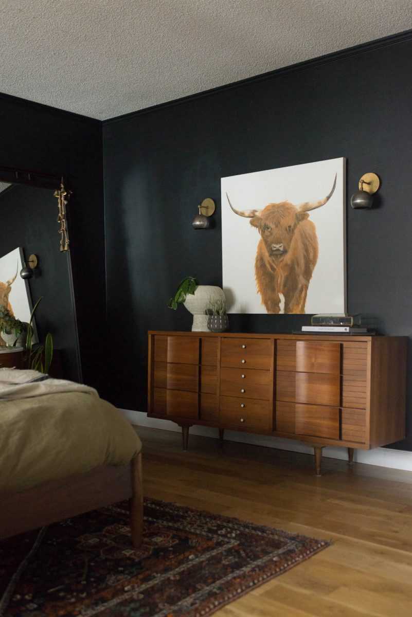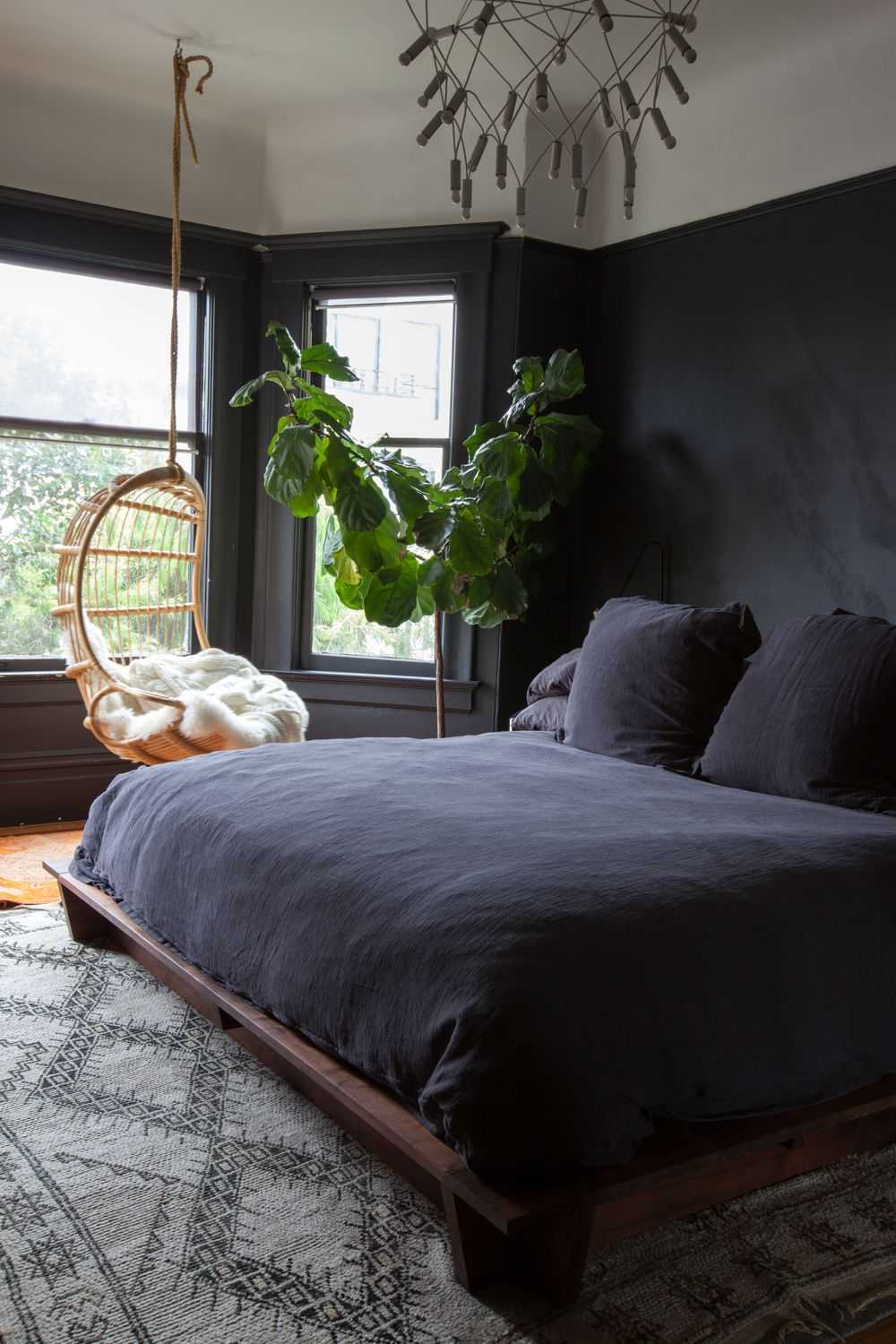 Черный может быть уместен на любой детали интерьера. Этот цвет может быть на полу, на стенах и даже на потолке. Главное, что нужно постоянно помнить — чисто черные стены подойдут только помещению большой площади. В небольшой спальне стены должны в большей части оставаться светлыми.