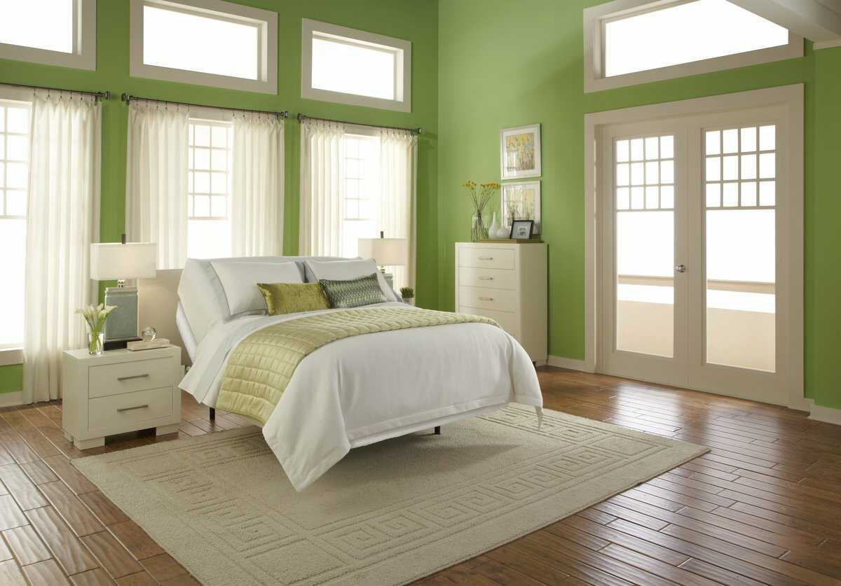 Сочные зеленые цвета для обустройства спальни подбирают в темном градиенте. Есть решения, когда зеленый настолько темен, что практически сливается с темным синим или черным. Такие фоны лучше всего разбавлять при помощи высветленного зеленого, имеющего приглушенную интенсивность.