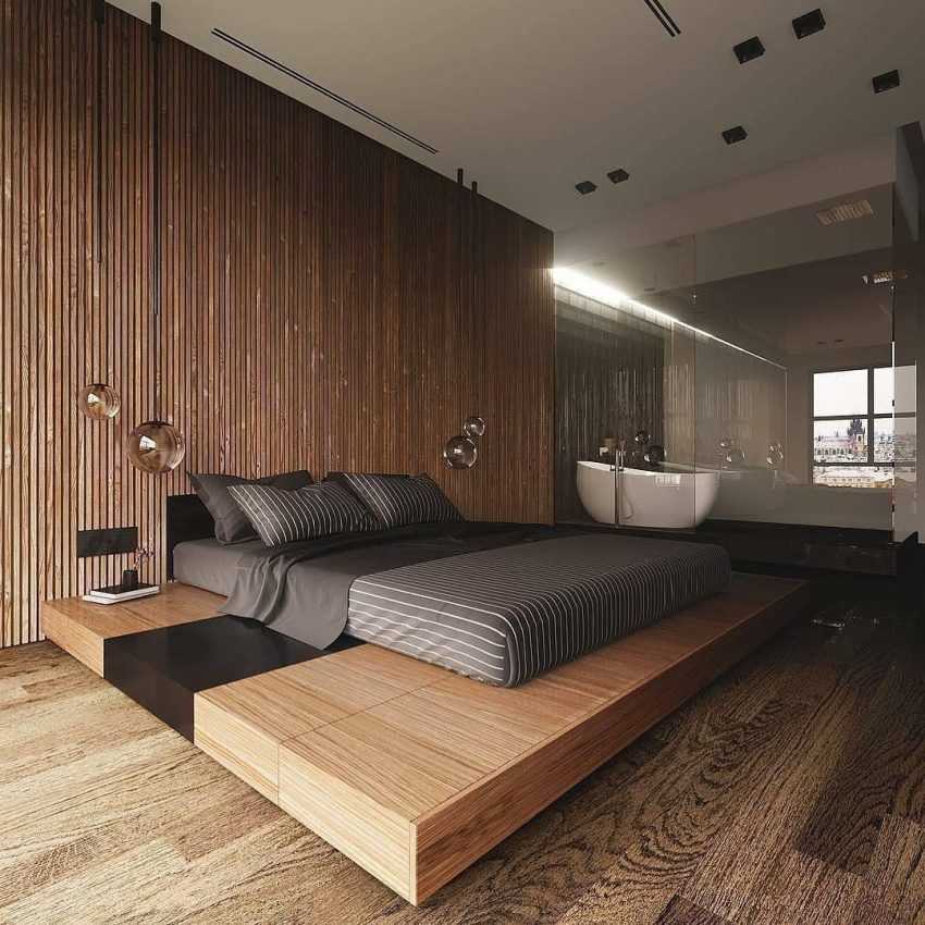 Данный вариант подойдет для создания эко-стиля. Стена выполняется из досок, деревянных панелей, легко крепится, не требует выравнивания, прячет провода и проста в уходе. Лучше всего смотрится у изголовья кровати в дополнении с настенными скульптурами или картинами.