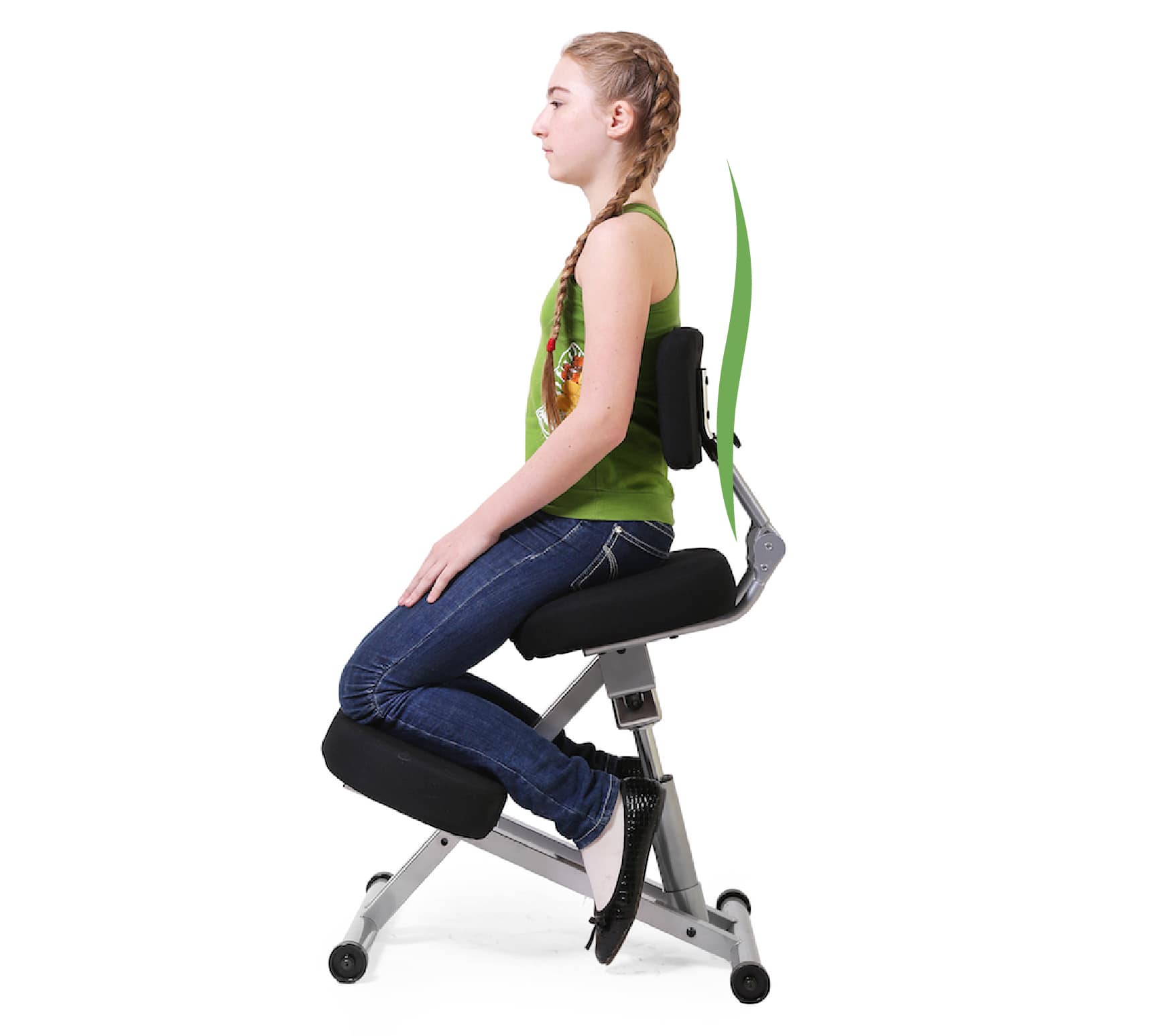Школьное кресло с опорой для ног полностью исключает возможность развития проблем со спиной. Вся нагрузка перемещается на голени, оставляя позвоночник в комфортном положении. Центр тяжести смещается, спина в такой позе максимально расслаблена.