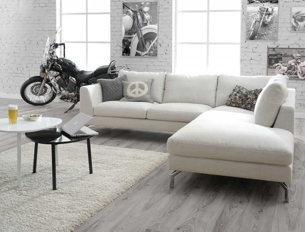 - Лофте. На фоне грубой фактуры стен, труб, других технических элементов мягкий светлый диван будет смотреться особенно выигрышно, станет островком нежности и чистоты. Цвет контрастных аксессуаров может быть любым ‒ теплым или холодным. Габаритные островные, модульные изделия словно предназначены для больших пространств лофта.
