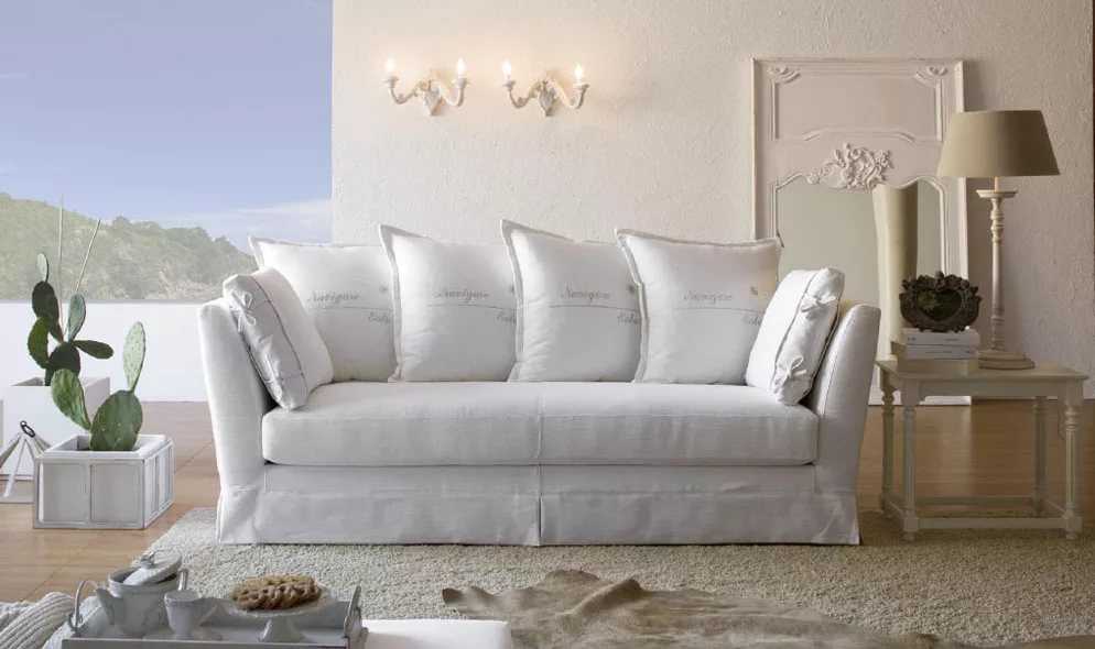 - Провансе. Олицетворяет элегантность, спокойствие, уют. Белый прованский диван мягок, комфортен, зачастую имеет ряд подушек с ручной вышивкой или украшениями. Ценится небольшая, но заметная изношенность (порой ее делают специально), словно мебель досталась в наследство и служит долго. Яркие контрасты не приняты, более уместны оттенки из аналогичной цветовой схемы ‒ нежные, пастельные.