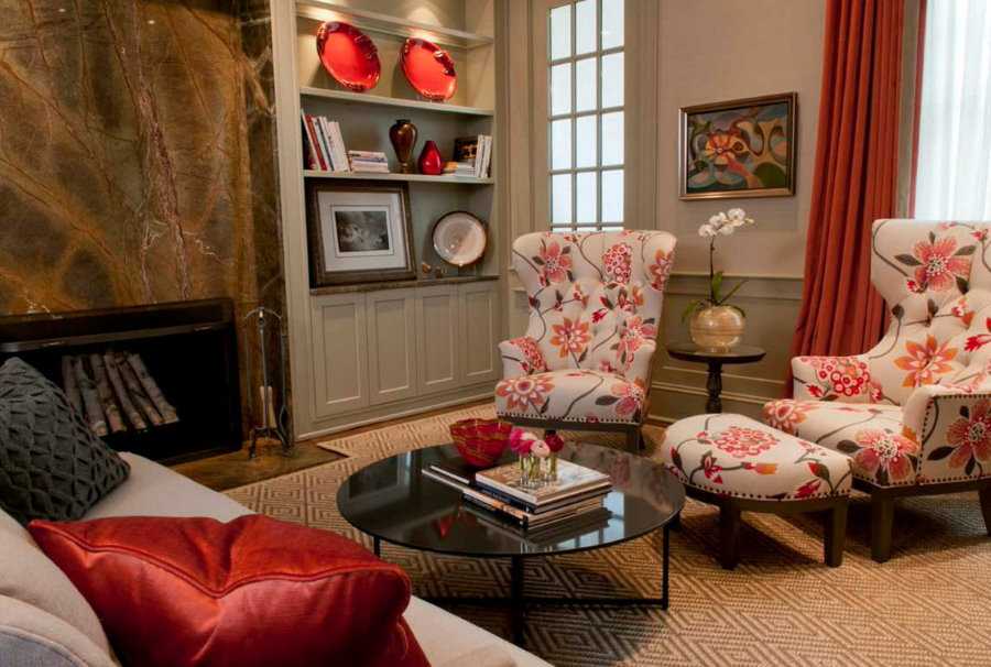 Обивка кресел в интерьере гостиных подбирается с учетом общего стиля комнаты. Например, гобелен будет красиво сочетаться с традиционной классикой, а серый шенилл или флок впишется в общий стиль лофта или хай-тека. Немаловажными являются и условия эксплуатации мягкой мебели. При частом использовании лучше выбирать плотные ткани с высокими показателями износостойкости.