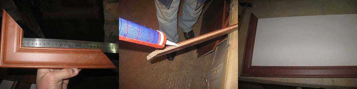 - На передюю часть конструкции крепится рама. Она может быть сбита из тонких деревянных реек или же представлять собой скрепленные металлические пластины. Для рамы можно использовать и профиль ПВХ. Рама также устанавливается на направляющий профиль, закрепляется клеем и саморезами.