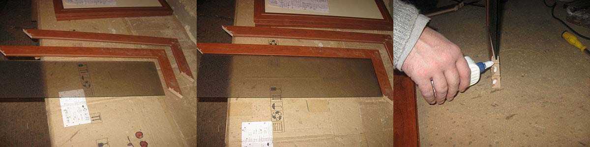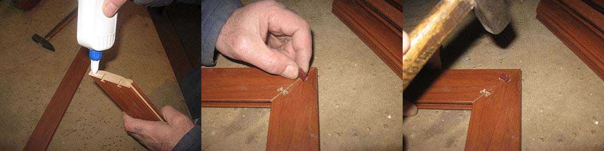 Приносим все домой и приступаем к сборке. Промазывем торцы профилей клеем ПВА и стыкуем первый угол, забивая в подготовленные пазы суры.