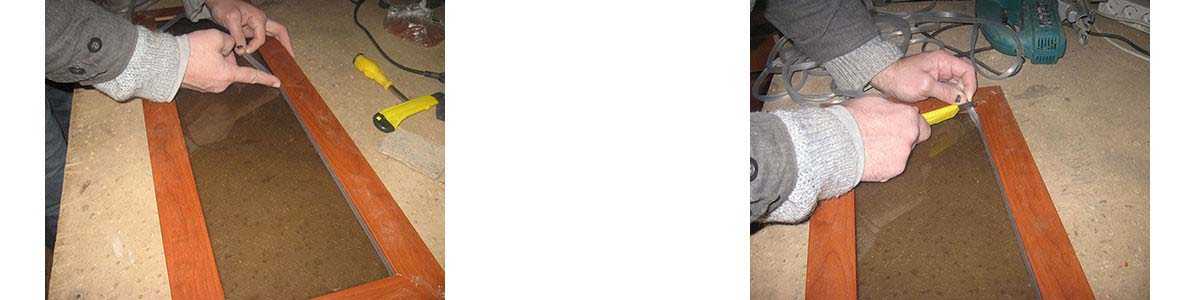Определившись с размерами, отправляемся в магазин или на базу, торгующую рамочными профилями. Здесь можно заказать не только материал, но и его раскрой по Вашим размерам, а также пазовку под суры – специальные крепления для рамочного профиля. Резка и пазовка производится на специальных станках, и выполнить ее в домашних условиях скорее всего не удастся. Но стоит такая работа не дорого, а собрать из готовых элементов двери совсем не сложно. Кроме нарезанного рамочного профиля и заполнений нам понадобятся суры (они же шпонки) – специальные пластиковые крепежи – «колышки», по 2 на каждый стык рамы, то есть на одну четырехугольную раму – 8 штук. А также клей ПВА, силиконовый герметик, уплотнитель (если вставка стеклянная), мебельный воск в тон профиля.