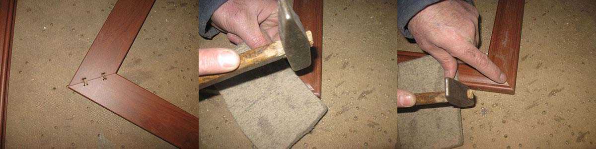Если стык не получился ровным – не беда. Молотком, обязательно через войлок, чтобы не повредить покрытие профилей, аккуратно подравниваем рамку, добиваясь красивого стыка.