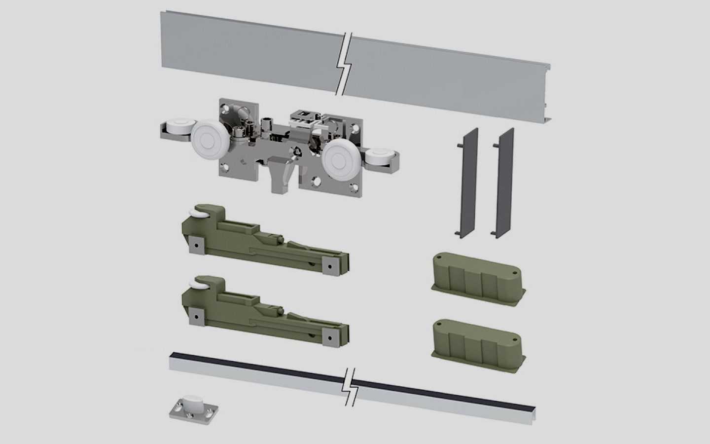 Комплект выпускается для двух или одного раздвижного полотна. Максимально допустимая нагрузка – 80 кг. В наборе имеется анодированная алюминиевая направляющая, ролики, крепления зажимов для стекол, стопоры, нижний проводник и скобы для крепления. Количество элементов зависит от числа полотен. Это влияет и на стоимость продукции. Реализуется во всех специализированных торговых точках. Можно заказать и в интернет – магазине, только убедившись в порядочности поставщика.